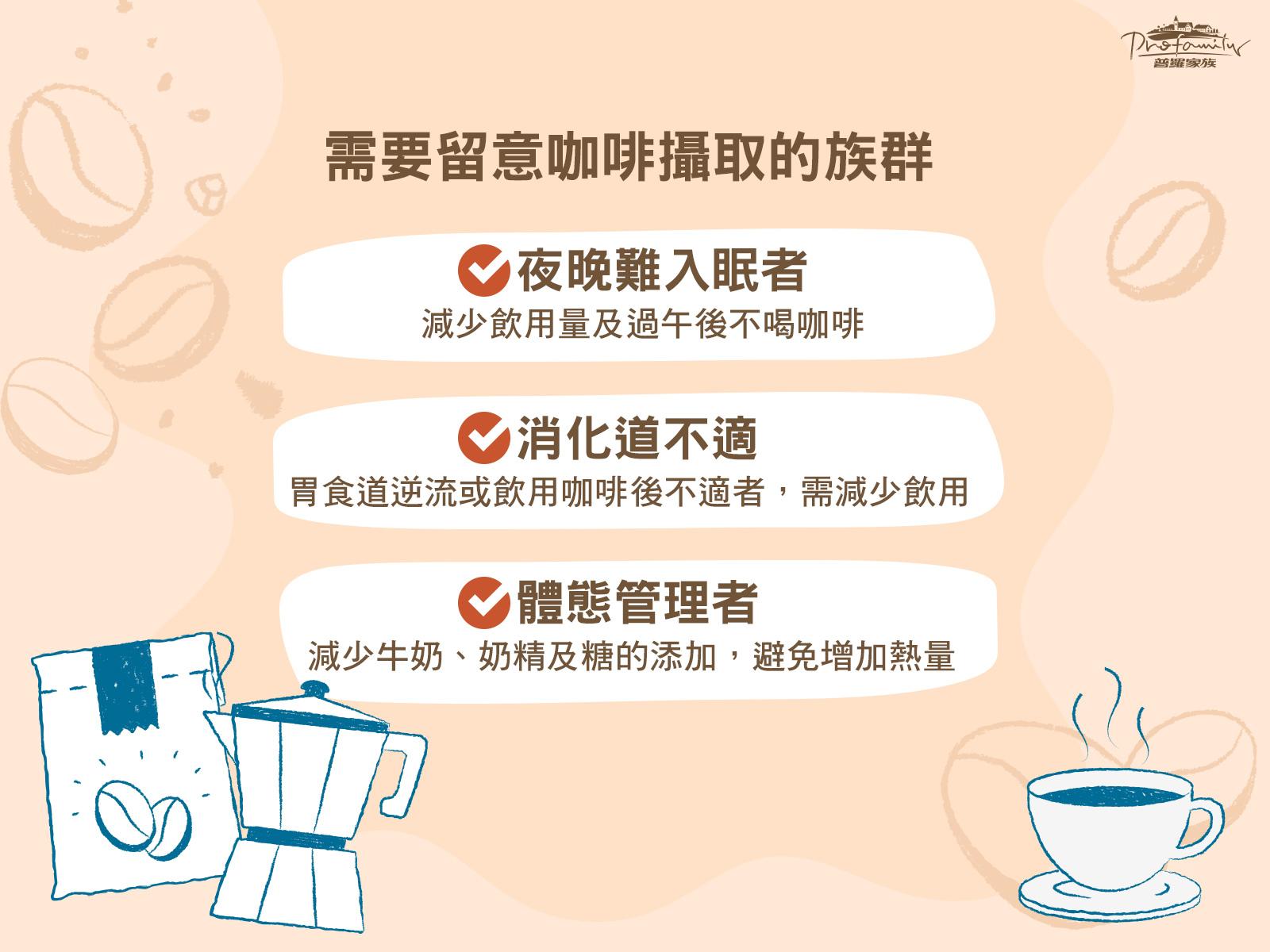- 消化道不適者:如果已有胃食道逆流症狀或者在飲用咖啡後容易感到不適者,需減少飲用頻率和份量。