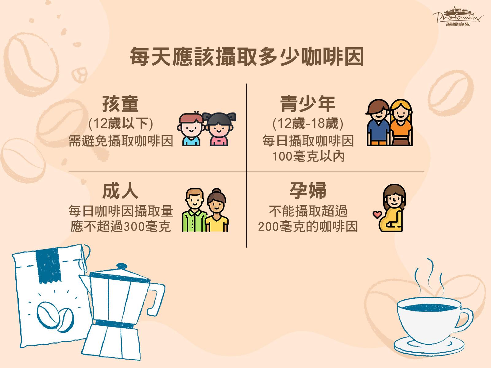 根據衛生福利部食品藥物管理署建議,成人每日咖啡因攝取量應不超過300毫克、12至18歲的青少年應在100毫克以內,而孕婦(最多不能攝取超過200毫克的咖啡因)及12歲以下孩童需避免攝取咖啡因。也依據連鎖飲料便利商店及速食業之現場調製飲料標示規定,店家須標示總咖啡因最高值或紅黃綠燈符號讓消費者分辨咖啡因含量,因此民眾在購買前都可以依據咖啡因含量選擇適合的品項,舉例而言: